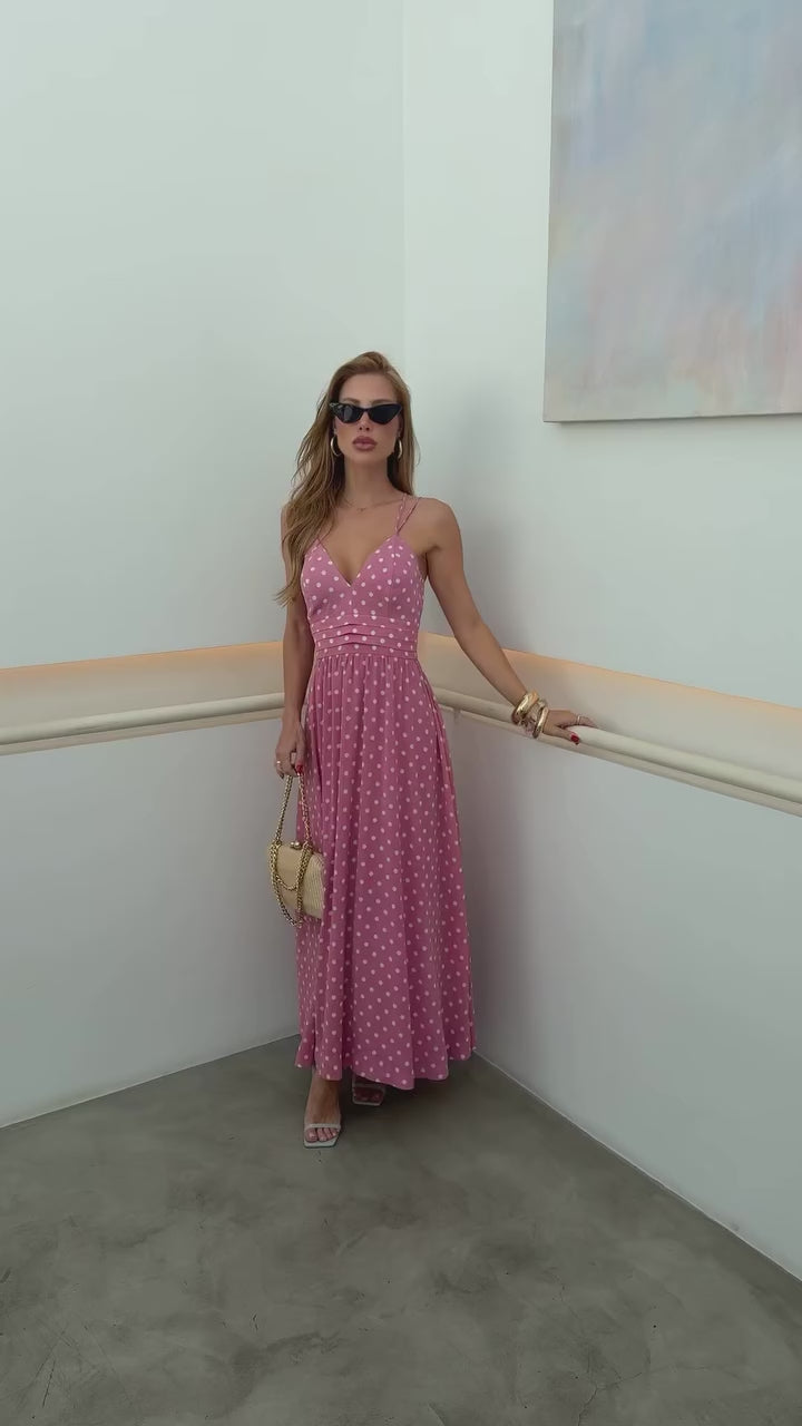 Vestido Salete Longo Poá Com Zíper nas Costas - Rosa